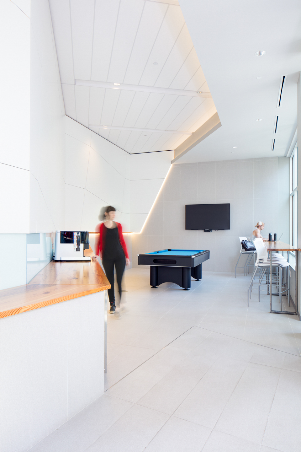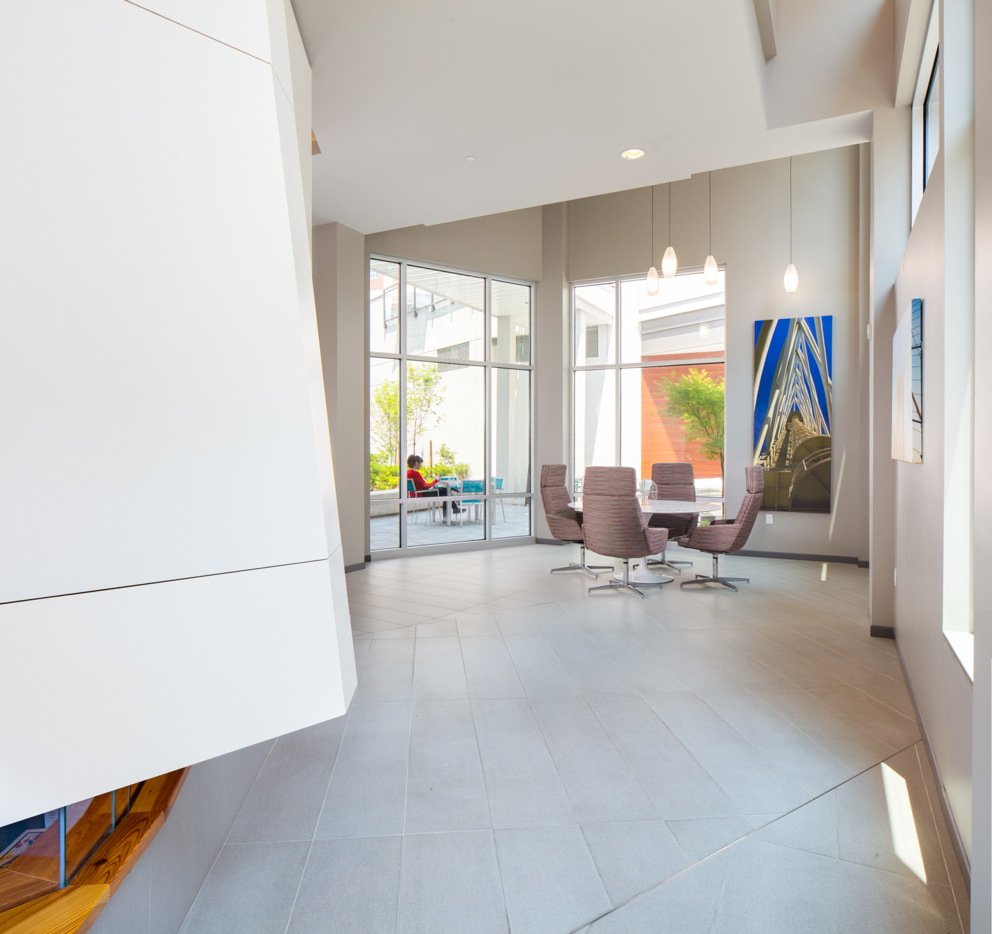 The dynamic lobby wraps around the geometric leasing/management office providing amenities like a ride share waiting area, a fitness room, a lounge, and an outdoor private patio. Though small in scale it sets the innovative tone for the whole product and is made visible by the extended glass walls along park avenue.